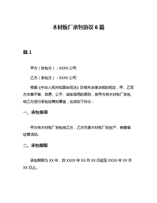 木材板厂承包协议6篇篇1甲方(发包方):XXXX公司乙方(承包方):XXXX公司根据《中华人民共和国合同法》及相关法律法规的规定,甲、乙双方本着平等、自愿、公平、诚实信用的原则,就甲方将木材板厂发包给乙方进行承包经营的事宜,达成如下协议:一、承包事项甲方将木材板厂发包给乙方,乙方负责木材板厂的生产、销售等经营活动。