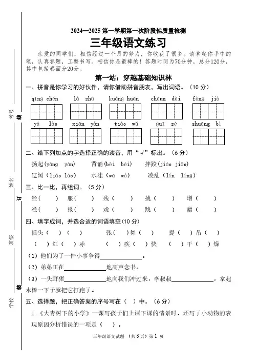 部编2024年新改版语文小学三年级上册第二次月考检测题(根据2024年部编新改版语文小学三年级上册三四单元教材编写)童话是我流浪一生的阿拉丁神灯。