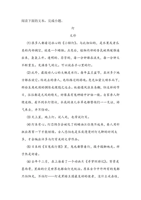 2、本文的叙事线索是:()──()──()本文的感情线索是:()──()──()3、小橘灯象征着_____________________,象征着________________________________。