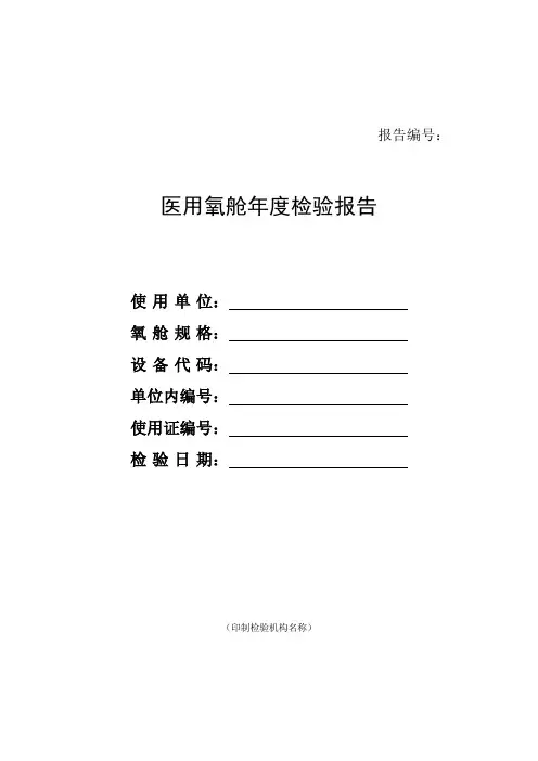 医用氧舱检验报告┌───────┬──────────────────────────┐│使用单位││├───────┼──────┬────┬──────────────┤│氧舱规格││设备编号││├───────┼──────┴────┴──────────────┤│ 使用证编号││├───────┼──────────────────────────┤│制造单位││├───────┼──────┬────┬──────────────┤│氧舱出厂日期││投用日期││├───────┼──────┴────┴──────────────┤│检验情况│□首次检验,□再次检验│├───────┴──────────────────────────┤│检验内容│├──────────────────────────────────┤│1.一年期定期检验项目│├──┬────┬─────────────────┬────┬───┤│序号│检验项目│检验情况│检验结果│备注│├──┼────┼─────────────────┼────┼───┤││││││├──┼────┼─────────────────┼────┼───┤││││││├──┴────┴─────────────────┴────┴───┤│2.配套压力容器定期检验│├──┬────┬─────────────────┬────┬───┤│序号│检验项目│检验情况│检验结果│ 备注│├──┼────┼─────────────────┼────┼───┤││││││├──┼────┼─────────────────┼────┼───┤││││││├──┴────┴─────────────────┴────┴───┤│3.电源输入与舱体间的绝缘情况│├──┬────┬─────────────────┬────┬───┤││││││├──┼────┼─────────────────┼────┼───┤││││││├──┴────┴─────────────────┴────┴───┤│4.消防和应急呼吸装置│├──┬────┬─────────────────┬────┬───┤││││││├──┼────┼─────────────────┼────┼───┤││││││└──┴────┴─────────────────┴────┴───┘注:一年期定期检验不检2、3、4项。