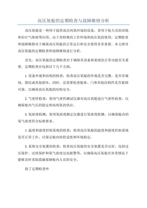 高压氧舱的定期检查与故障维修分析高压氧舱是一种用于提供高压纯氧环境的设备,常用于航天员的训练和治疗气体病等应用。