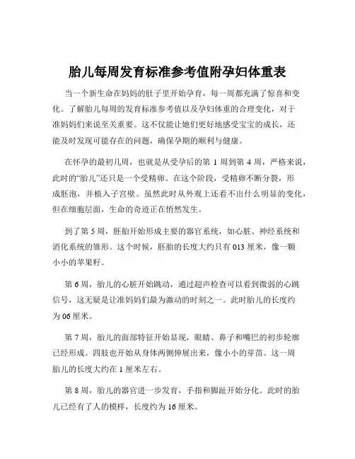 胎儿每周发育标准参考值附孕妇体重表当一个新生命在妈妈的肚子里开始孕育,每一周都充满了惊喜和变化。