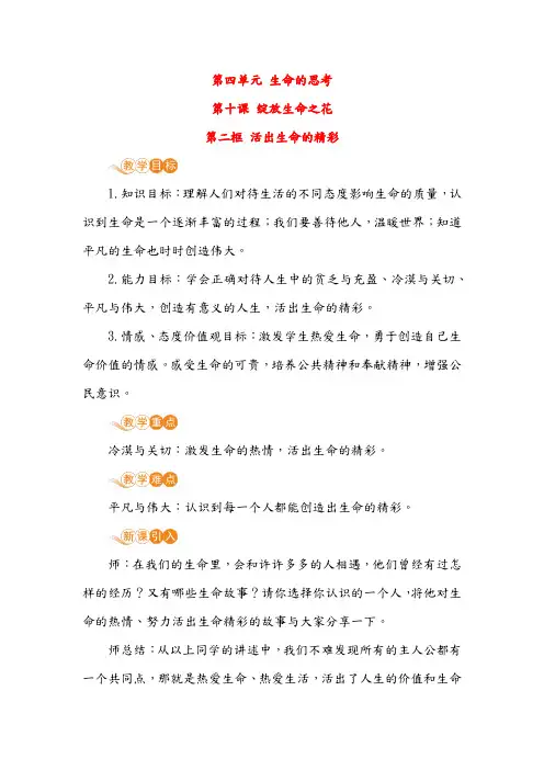 三. 教学目标1.让学生理解生命的价值,认识到每个人都有能力让自己的生命更加精彩。