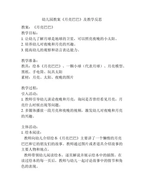 幼儿园小班语言教案《月亮巴巴》含反思教学内容:《月亮巴巴》教学目标:1.了解中秋节的由来,加强幼儿对传统文化的认知和理解。