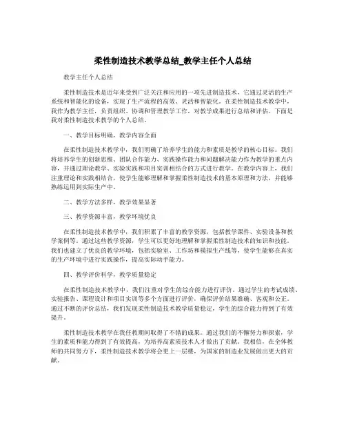 柔性制造技术教学总结_教学主任个人总结教学主任个人总结柔性制造技术是近年来受到广泛关注和应用的一项先进制造技术,它通过灵活的生产系统和智能化的设备,实现了生产流程的高效、灵活和智能化。