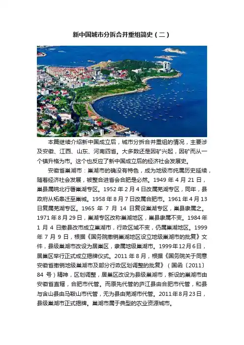 关于“三分巢湖”的几点思考摘要2011年夏天,安徽省巢湖市被一分为三,分别并入安徽省合肥、芜湖和马鞍山市的版图。