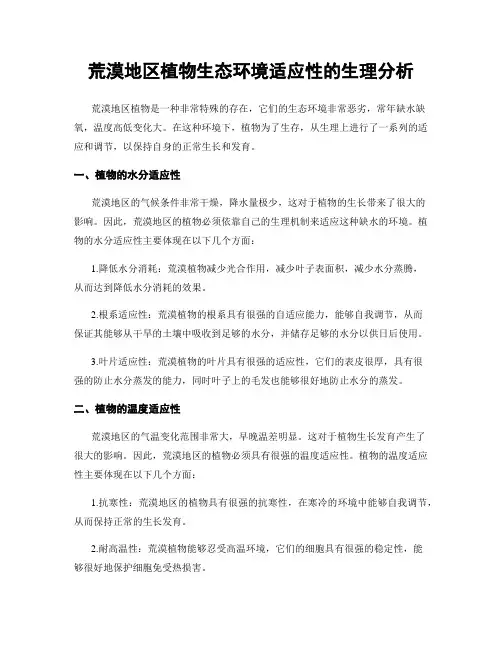 一、植物的水分适应性荒漠地区的气候条件非常干燥,降水量极少,这对于植物的生长带来了很大的影响。