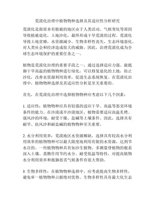 荒漠化治理中植物物种选择及其适应性分析研究荒漠化是指原本有植被的地区由于人类活动、气候变化等原因导致植被退化,土地沙化,最终形成干旱荒漠的过程。