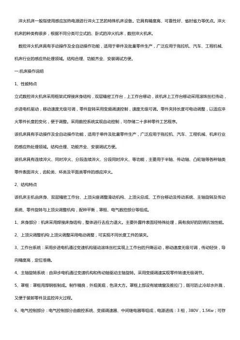 一.机床操作说明1、性能特点立式数控淬火机床采用框架式焊接床身结构,双层精密工作台,上工作台移动,该机床上工作台移动采用滚珠丝杠传动,步进电机驱动,移动速度无级可调,零件旋转采用变频调速控制,速度无级可调。