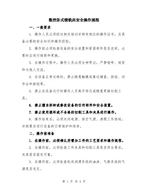 二、安全操作规程1. 在操作前必须检查设备操作数控机床卧式车床前,必须检查设备的各项性能是否正常,包括机床、夹具、刀具等部件的状态。