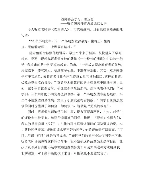 《贾志敏老师的讲座及课堂实录》听后感2021-02-13《贾志敏老师的讲座及课堂实录》听后感这段时间我在谢春婷语文工作室的要求下认真聆听了贾志敏老师的讲座及课堂实录。