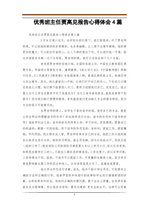 优秀班主任贾高见报告心得体会4篇优秀班主任贾高见报告心得体会第1篇3月9日周六这天,在何校长的引荐下,我们很荣幸,听了贾老师的课,可以说他的课讲的非常精彩,也非常幽默。