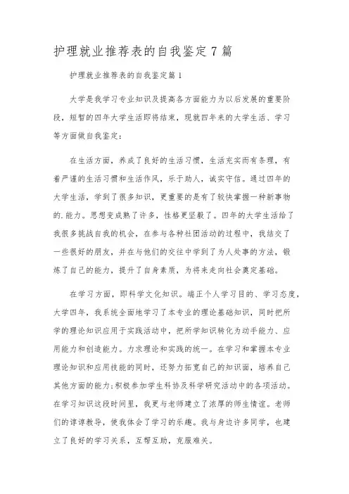 护理就业推荐表的自我鉴定7篇护理就业推荐表的自我鉴定篇1大学是我学习专业知识及提高各方面能力为以后发展的重要阶段,短暂的四年大学生活即将结束,现就四年来的大学生活、学习等方面做自我鉴定:在生活方面,养成了良好的生活习惯,生活充实而有条理,有着严谨的生活习惯和生活作风,乐于助人,诚实守信。