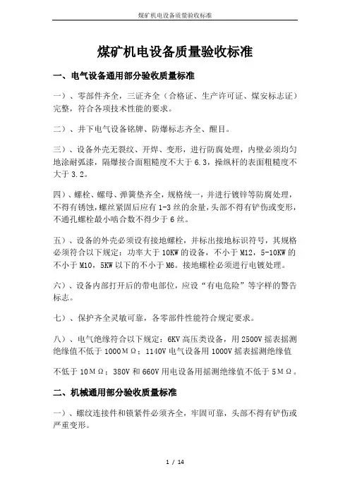 八)、电气绝缘符合以下规定:6KV高压类设备,用2500V摇表摇测绝缘值不低于1000ΜΩ;1140V电气设备用1000V摇表摇测绝缘值不低于10ΜΩ;380V和660V用电设备用摇测绝缘值不低于5ΜΩ.二、机械通用部分验收质量标准一)、螺纹连接件和锁紧件必须齐全,牢固可靠,头部不得有铲伤或严重变形。