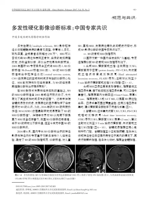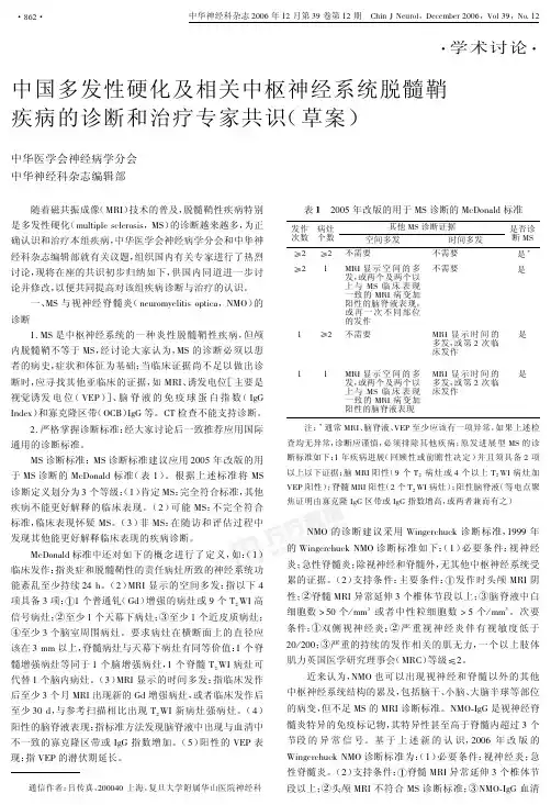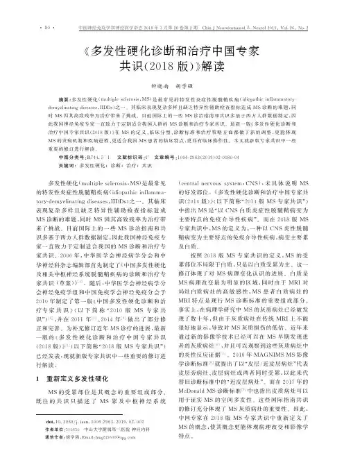 ‘多发性硬化诊断和治疗中国专家共识(2018版)“解读钟晓南 胡学强d o i :10.3969/j.i s s n .1006-2963.2019.02.002作者单位:510630 中山大学附属第三医院神经内科通信作者:胡学强,E m a i l :h x q 245600@q q.c o m 摘要:多发性硬化(m u l t i p l e s c l e r o s i s ,M S )是最常见的特发性炎症性脱髓鞘疾病(i d i o p a t h i c i n f l a mm a t o r y-d e m y e l i n a t i n g d i s e a s e s ,I I D D s )之一㊂其临床表现复杂多样且缺乏特异性辅助检查指标造成M S 诊断的难题,同时M S 因其高致残率为治疗带来了挑战㊂目前国际上的一些M S 诊治指南和共识多基于西方人群数据制定,因此我国神经免疫专家一直致力于定制适合我国人群的M S 诊断和治疗专家共识㊂最新一版‘多发性硬化诊断和治疗中国专家共识(2018版)“在M S 的定义㊁临床分型㊁诊断标准和治疗策略方面都做了新的调整,更能体现M S 的发病机制和疾病进程㊁更适合我国M S 患者的临床特点,更具有临床操作性㊂本文就新版专家共识中一些重要的修订进行解读㊂中图分类号:R 744.5+1 文献标识码:C 文章编号:1006-2963(2019)02-0080-04关键词:多发性硬化;诊断;治疗;共识多发性硬化(m u l t i pl e s c l e r o s i s ,M S )是最常见的特发性炎症性脱髓鞘疾病(i d i o pa t h i c i n f l a mm a -t o r y -d e m y e l i n a t i n g di s e a s e s ,I I D D s )之一㊂其临床表现复杂多样且缺乏特异性辅助检查指标造成M S 诊断的难题,同时M S 因其高致残率为治疗带来了挑战㊂目前国际上的一些M S 诊治指南和共识多基于西方人群数据制定,因此我国神经免疫专家一直致力于定制适合我国的M S 诊断和治疗专家共识㊂2006年,中华医学会神经病学分会和中华神经科杂志编辑部首先制定了‘中国多发性硬化及相关中枢神经系统脱髓鞘疾病的诊断和治疗专家共识(草案)“[1]㊂随后,中华医学会神经病学分会神经免疫学组和中国免疫学会神经免疫分会于2010年制定了第一版‘中国多发性硬化诊断和治疗专家共识“(以下简称 2010版M S 专家共识 )[2],并在2011年[3]㊁2014年[4]做出了部分修正和完善㊂为补充修订近年M S 诊疗的进展,最新一版的‘多发性硬化诊断和治疗中国专家共识(2018版)“[5](以下简称 2018版M S 专家共识 )已经发表,现就新版专家共识中一些重要的修订进行解读㊂1 重新定义多发性硬化M S 的受累部位是其概念的重要组成部分㊂既往的共识只描述了M S 累及中枢神经系统(c e n t r a l n e r v o u ss ys t e m ,C N S ),未具体说明M S 的好发部位㊂‘多发性硬化诊断和治疗中国专家共识(2014版)“(以下简称 2014版M S 专家共识 )中指出M S 是 以C N S 白质炎症性脱髓鞘病变为主要特点的免疫介导性疾病 ㊂而在2018版M S 专家共识中,M S 的定义为:一种以C N S 炎性脱髓鞘病变为主要特点的免疫介导性疾病,病变主要累及白质㊂按照2018版M S 专家共识的定义,M S 的受累部位不局限于白质,只是以白质受累为主㊂这一修订体现了对M S 病理变化认识的进展㊂白质是M S 病理改变最为明显的区域,同时由于M R I 对局灶白质病灶的高敏感性,M S 患者白质病灶的M R I 特点是现行M S 诊断标准的重要组成部分㊂事实上,在病理学研究中M S 的灰质病灶已经被发现了数十年,但由于灰质病灶在传统M R I 上不能很好地显示,导致对M S 灰质损伤的低估㊂近年来通过新的影像学技术已经可以在M S 早期发现患者的灰质病灶[6],并且可以观察到这些灰质病灶中的炎性反应证据[7]㊂2016年MA G N I M SM S 影像学诊断标准[8]就提出了以 皮层/近皮层病灶 代表皮层旁病灶㊁皮层病灶或两者同时受累,以此来代替旧诊断标准中的 近皮层病灶 ㊂而在2017年的M c D o n a l dM S 诊断标准[9]中也指出皮质病灶可以用于证实M S 的空间多发性㊂这些国际指南共识的修订充分体现了M S 灰质病灶的重要性㊂因此,中国专家在2018版M S 专家共识中重新定义了M S 的概念,使其概念更能体现病理改变和影像学特点㊂㊃08㊃中国神经免疫学和神经病学杂志2019年3月第26卷第2期 C h i n JN e u r o i mm u n o l&N e u r o l 2019,V o l .26,N o .22更能体现疾病病情的M S临床分型M S的临床分型对M S患者的治疗选择和预后评估均具有重要意义㊂自2010版M S专家共识开始,M S的临床分型一直沿用1996年美国国家多发性硬化学会制定的分型标准[10],把M S分为复发缓解型(r e l a p s i n g-r e m i t t i n g m u l t i p l e s c l e r o s i s,R R M S)㊁继发进展型(s e c o n d a r y-p r o-g r e s s i v e m u l t i p l es c l e r o s i s,S P M S)㊁原发进展型(p r i m a r y-p r o g r e s s i v em u l t i p l e s c l e r o s i s,P P M S)和进展复发型(p r o g r e s s i v er e l a p s i n g m u l t i p l es c l e-r o s i s,P R M S)㊂同时根据M S的发病情况及预后提出了2种与国际通用临床分型存在一定交叉的少见临床类型,即良性型M S和恶性型M S㊂在新的2018版M S专家共识中,M S临床分型采用了最新的2013年国际分型[11],即M S分为R R M S㊁S P M S和P P M S,同时仍然沿用良性型M S和恶性型M S的分型㊂新旧分型虽然在命名上重叠,但两者对M S的划分条件和标准有着本质上的区别㊂旧M S临床分型主要依据患者的临床病程作为分型依据,缺乏M R I㊁生物学和其他相关标记物,使其不能贴切地反映M S的临床特点和发病机制㊂新的M S临床分型需要通过临床复发㊁影像学等其他客观临床资料综合评估M S的 疾病活动性 和 疾病进展性 ㊂当引入 疾病活动性 的概念后,既往P R M S的分型将不复存在:有急性发作