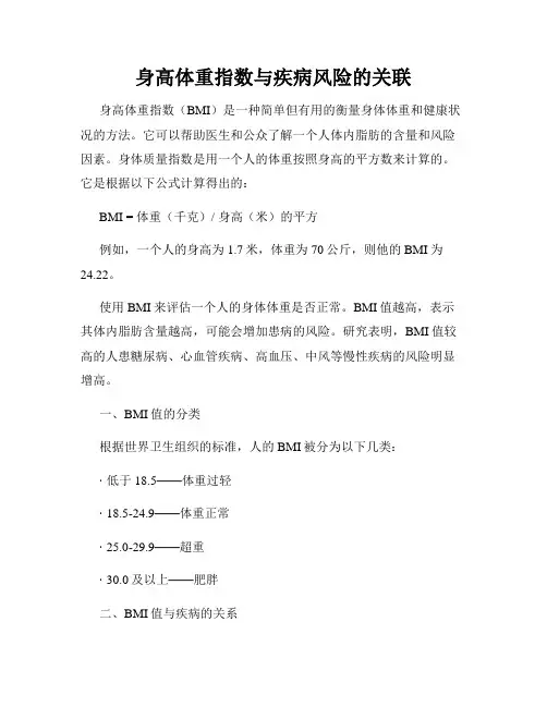 一、BMI值的分类根据世界卫生组织的标准,人的BMI被分为以下几类:·低于18.5——体重过轻· 18.5-24.9——体重正常· 25.0-29.9——超重· 30.0及以上——肥胖二、BMI值与疾病的关系研究表明,BMI值与许多慢性疾病之间存在着密切的联系。
