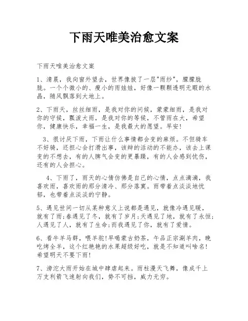 下雨天唯美治愈文案下雨天唯美治愈文案1、清晨,我向窗外望去,世界像披了一层"雨纱",朦朦胧胧。