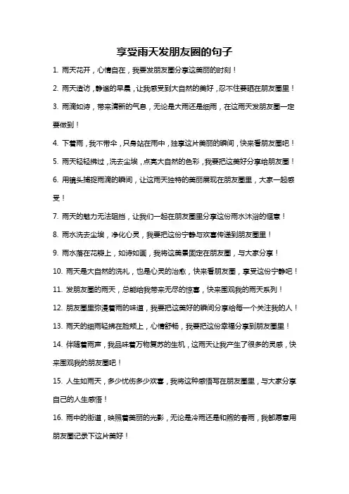 享受雨天发朋友圈的句子1. 雨天花开,心情自在,我要发朋友圈分享这美丽的时刻!2. 雨天造访,静谧的早晨,让我感受到大自然的美好,忍不住要晒在朋友圈里!3. 雨滴如诗,带来清新的气息,无论是大雨还是细雨,在这雨天发朋友圈一定要做到!4. 下着雨,我不带伞,只身站在雨中,独享这片美丽的瞬间,快来看朋友圈吧!5. 雨天轻轻拂过,洗去尘埃,点亮大自然的色彩,我要把这美好分享给朋友圈!6. 用镜头捕捉雨滴的瞬间,让这雨天独特的美丽展现在朋友圈里,大家一起感受!7. 雨天的魅力无法阻挡,让我们一起在朋友圈里分享这份雨水沐浴的惬意!8. 雨水洗去尘埃,净化心灵,我要把这份宁静与欢喜传递到朋友圈里!9. 雨水落在花瓣上,如诗如画,我将这美景固定在朋友圈,与大家分享!10. 雨天是大自然的洗礼,也是心灵的治愈,快来看朋友圈,享受这份宁静吧!11. 发朋友圈的雨天,总能给我带来无尽的惊喜,快来围观我的雨天系列!12. 朋友圈里弥漫着雨的味道,我要把这美好的瞬间分享给每一个关注我的人!13. 雨天的细雨轻拂在脸颊上,心情舒畅,我要把这份幸福分享到朋友圈里!14. 伴随着雨声,我品味着万物复苏的生机,这雨天让我产生了很多的灵感,快来围观我的朋友圈吧!15. 人生如雨天,多少忧伤多少欢喜,我将这种感悟写在朋友圈里,与大家分享自己的人生感悟!16. 雨中的街道,映照着美丽的光影,无论是冷雨还是和煦的春雨,我都愿意用朋友圈记录下这片美好!17. 雨淅沥沥地下着,我拿起手机,记录这特殊的时刻,贴在朋友圈里,和大家分享这份美丽!18. 在雨中漫步,感受雨滴的触感,我用镜头记录下这些细节,上传到朋友圈,与大家分享这份美妙!19. 雨天给城市平添了几分柔和和浪漫,我将这浪漫的时刻定格在朋友圈,与大家一起欣赏!20. 雨季来临,我要用朋友圈记录下每一个雨点的瞬间,展示雨天的美丽给每一位朋友!21. 雨天把人们凝视的目光洗刷干净,在这样的时刻发个朋友圈是多么畅快的事情!22. 雨水滋润万物,把城市染上一抹翠绿,我要在朋友圈里分享这片美丽的水彩画!。