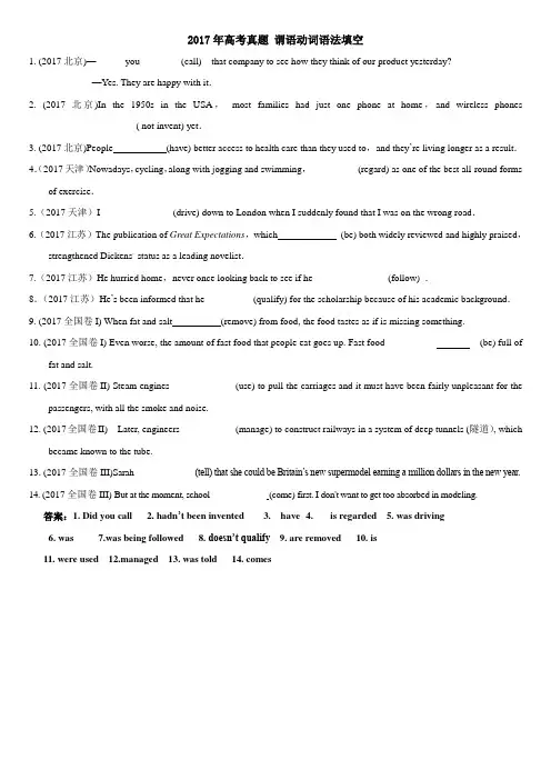 2017年高考真题谓语动词语法填空1. (2017北京)—______you ________(call) that company to see how they think of our product yesterday?—Yes. They are happy with it.2. (2017北京)In the 1950s in the USA,most families had just one phone at home,and wireless phones__________________( not invent) yet.3. (2017北京)People (have) better access to health care than they used to,and they’re living longer as a result.4.(2017天津)Nowadays,cycling,along with jogging and swimming,__________ (regard) as one of the best all-round forms of exercise.5.(2017天津)I ______________ (drive) down to London when I suddenly found that I was on the wrong road.6.(2017江苏)The publication of Great Expectations,which (be) both widely reviewed and highly praised,strengthened Dickens,status as a leading novelist.7.(2017江苏)He hurried home,never once looking back to see if he_______________ (follow) .8.(2017江苏)He’s been informed that he _________ (qualify) for the scholarship because of his academic background.9. (2017全国卷I) When fat and salt (remove) from food, the food tastes as if is missing something.10. (2017全国卷I) Even worse, the amount of fast food that people eat goes up. Fast food __________ (be) full offat and salt.11. (2017全国卷II) Steam engines _____________(use) to pull the carriages and it must have been fairly unpleasant for thepassengers, with all the smoke and noise.12. (2017全国卷II) Later, engineers ___________(manage) to construct railways in a system of deep tunnels (隧道), whichbecame known to the tube.13. (2017全国卷III)Sarah ___________ (tell) that she could be Britain’s new supermodel earning a million dollars in the new year.14. (2017全国卷III) But at the moment, school ____________ (come) first. I don't want to get too absorbed in modeling.答案:1. Did you call 2. hadn’t been invented 3. have 4. is regarded 5. was driving6. was7.was being followed8. doesn’t qualify9. are removed 10. is11. were used 12.managed 13. was told 14. comes。