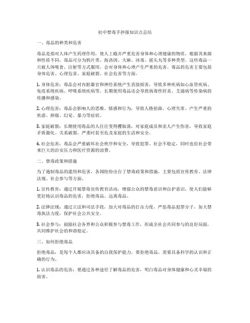 初中禁毒手抄报知识点总结一、毒品的种类和危害毒品是指对人体产生药理作用,使人上瘾并严重危害身体和心理健康的物质。