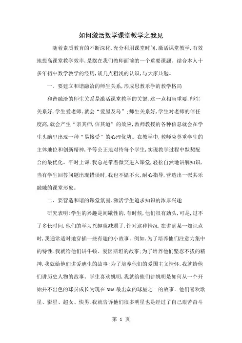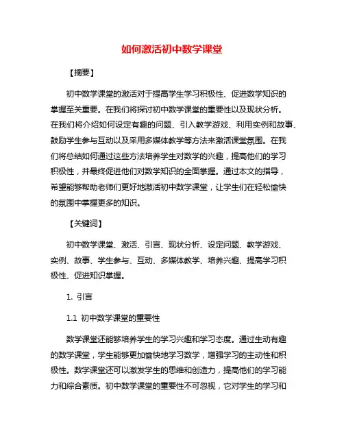 1. 引言1.1 初中数学课堂激活的重要性激活初中数学课堂不仅可以提高学生学习的主动性和积极性,还可以增强学生对数学知识的兴趣和理解。