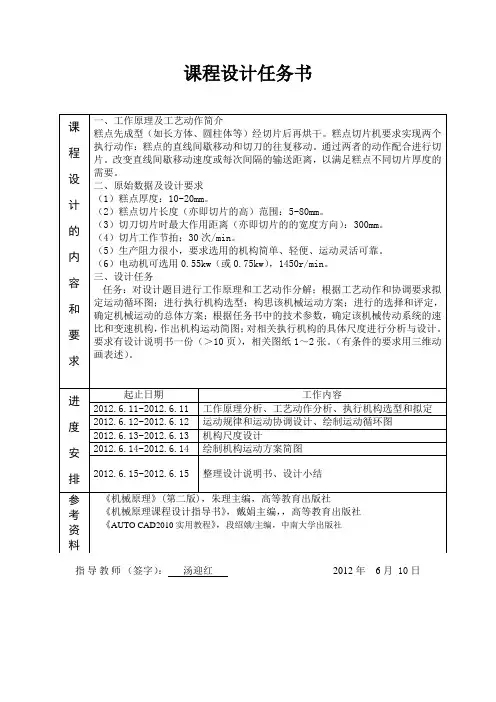 课程设计任务书指导教师(签字):汤迎红2012年6月 10日1.设计题目:糕点切片机的设计1.1设计原理:糕点先成型(如长方体、圆柱体等)经切片后再烘干。