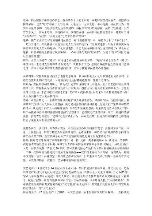 西方文论涵盖了许多名词和概念,下面将对其中的几个常见名词进行解释:1. 文艺理论:文艺理论是研究文学艺术的基本原则和规律的学科,主要关注文学作品的内在结构、创作方法和审美原则等问题。
