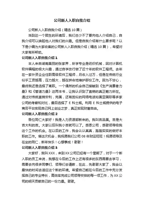 但是自我介绍有什么要求呢?以下是小编为大家收集的公司新人入职自我介绍(精选10篇),希望对大家有所帮助。