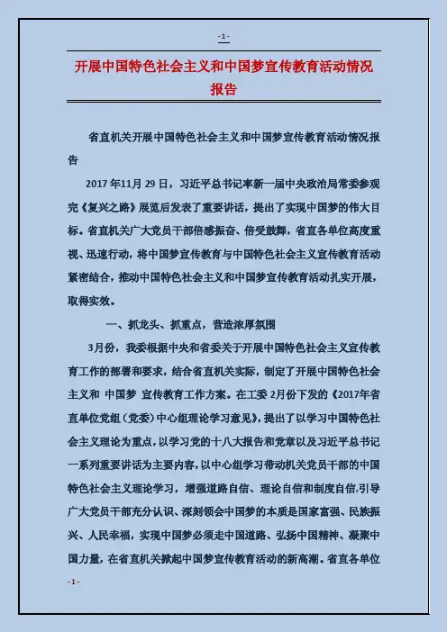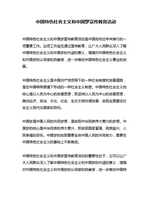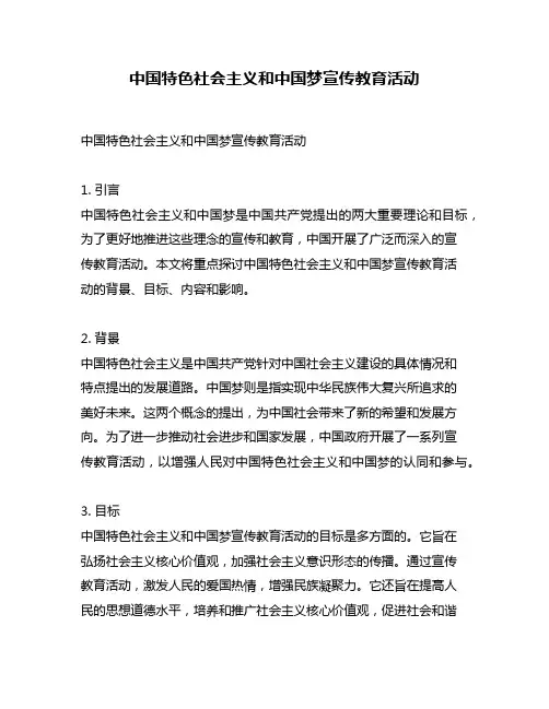 中国特色社会主义和中国梦宣传教育活动中国特色社会主义和中国梦宣传教育活动1. 引言中国特色社会主义和中国梦是中国共产党提出的两大重要理论和目标,为了更好地推进这些理念的宣传和教育,中国开展了广泛而深入的宣传教育活动。