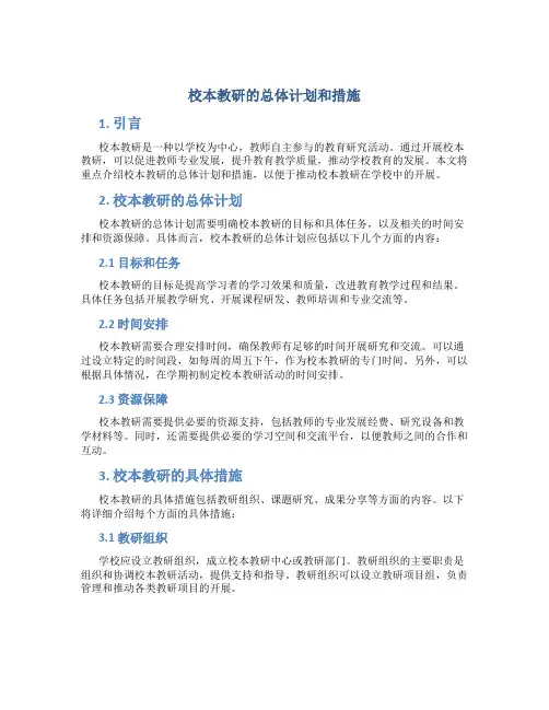 校本教研的总体计划和措施1. 引言校本教研是一种以学校为中心,教师自主参与的教育研究活动。
