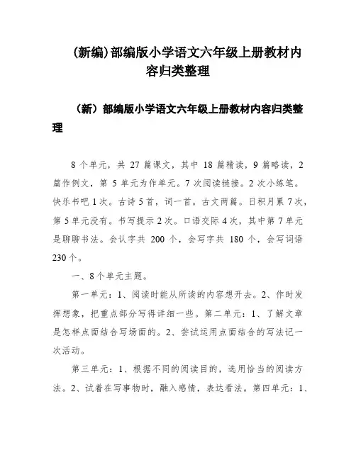 (新编)部编版小学语文六年级上册教材内容归类整理(新)部编版小学语文六年级上册教材内容归类整理8个单元,共27篇课文,其中18篇精读,9篇略读,2篇作例文,第5单元为作单元。