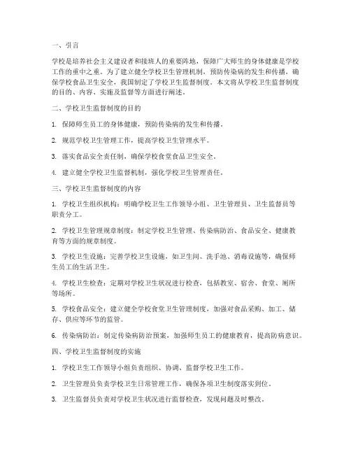 学校卫生工作督查制度一、制度背景学校是学生学习生活的空间,为保障学生身心健康,学校卫生工作的重要性不容忽视。