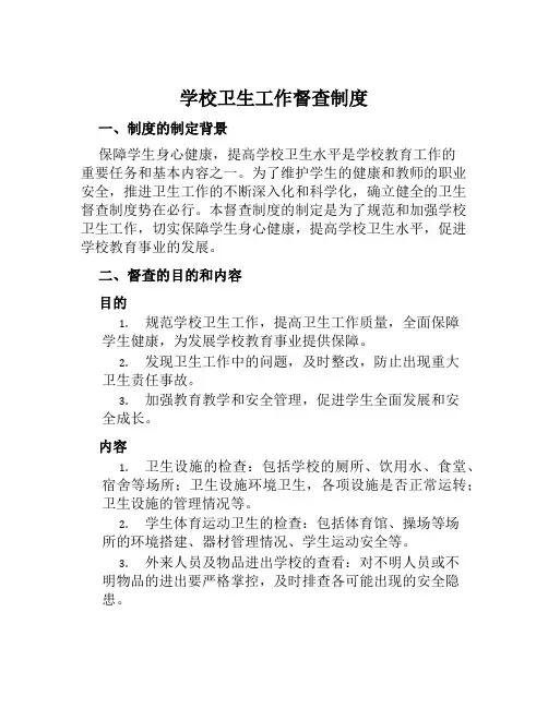 学校卫生工作督查制度一、制度的制定背景保障学生身心健康,提高学校卫生水平是学校教育工作的重要任务和基本内容之一。