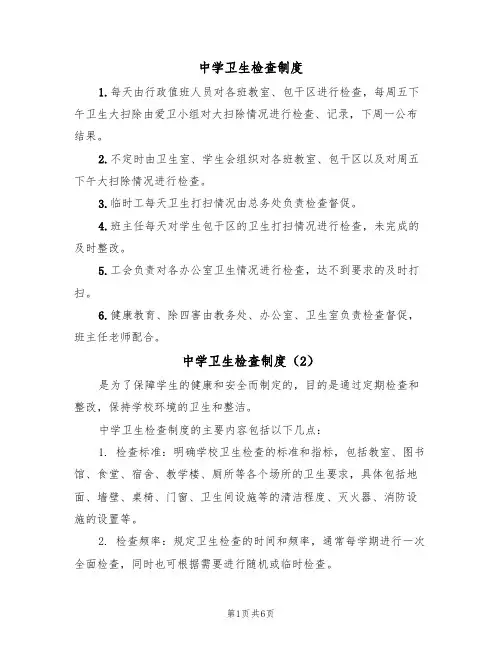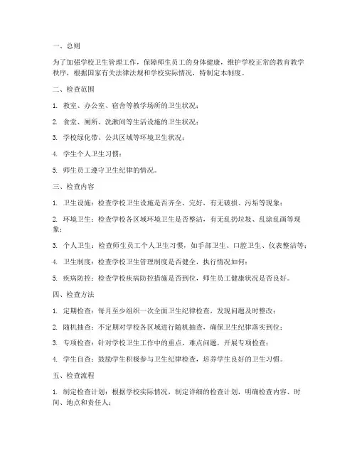 三、检查内容1. 卫生设施:检查学校卫生设施是否齐全、完好,有无破损、污垢等现象;2. 环境卫生:检查学校各区域环境卫生是否整洁,有无乱扔垃圾、乱涂乱画等现象;3. 个人卫生:检查师生员工个人卫生习惯,如手部卫生、口腔卫生、仪表整洁等;4. 卫生制度:检查学校卫生管理制度是否健全,执行情况如何;5. 疾病防控:检查学校疾病防控措施是否到位,师生员工健康状况是否良好。