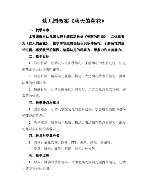 幼儿园秋天教案《秋天的菊花》教案标题:秋天的菊花教学目标:1.了解秋天的特点,能正确说出、表演“秋天的菊花”这首儿歌。
