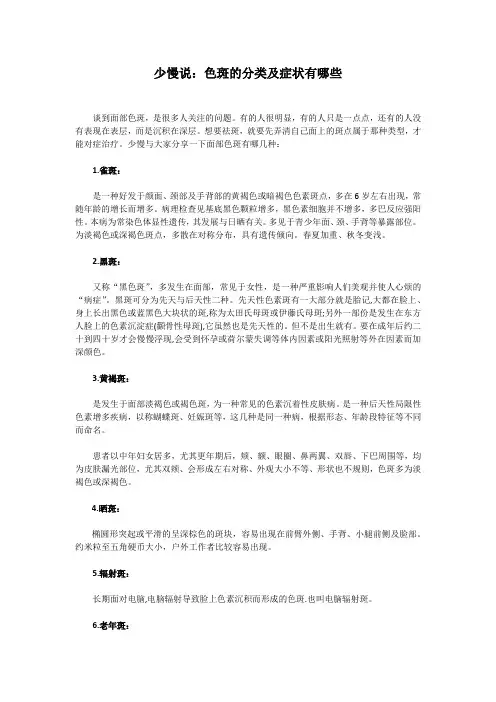 一、脸部斑点的分类脸部斑点可以分为多种类型,包括黑斑、雀斑、老年斑等。