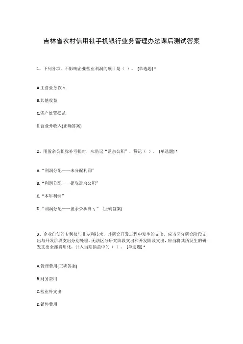 吉林省农村信用社手机银行业务管理办法课后测试答案1、下列各项,不影响企业营业利润的项目是()。