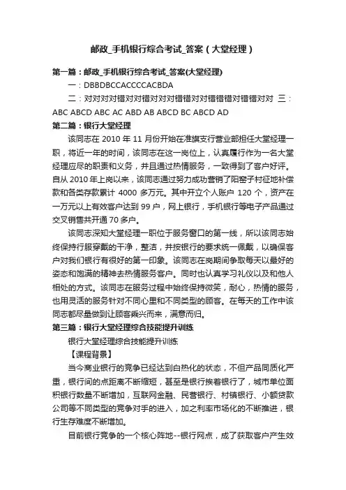 邮政_手机银行综合考试_答案(大堂经理)第一篇:邮政_手机银行综合考试_答案(大堂经理)一:DBBDBCCACCCCACBDA二:对对对对错对对错对对对错错对对错错错对错错对对三:ABC ABCD ABC AC ABD AB ABCD BC ABCD AD第二篇:银行大堂经理该同志在2010年11月份开始在准旗支行营业部担任大堂经理一职,将近一年的时间,该同志在这一岗位上,认真履行作为一名大堂经理应尽的职责和义务,并且通过热情服务,一致得到了客户好评。