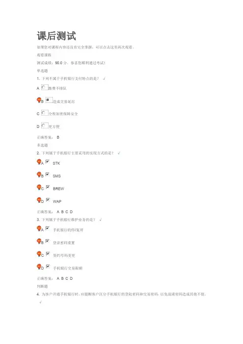 恭喜您顺利通过考试!单选题1. 下列不属于电话银行服务特点的是?√A 操作简单B 安全性低C 实现银行24小时服务D 可配置传真接口正确答案: B2. 下列不属于电话银行开通方式的是?√A 电话开通B 短信开通C 网银开通D 柜面开通正确答案: B多选题3. 下列属于个人电话银行业务的是?×A 账户查询B 转账服务C 自助缴费D 银证转账正确答案: A B C D4. 对公电话银行解约,客户只能到开户网点进行解约。