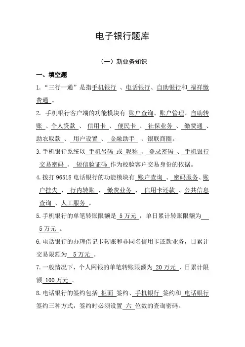 电子银行题库(一)新业务知识一、填空题1.“三行一通”是指手机银行、电话银行、自助银行和福祥缴费通。