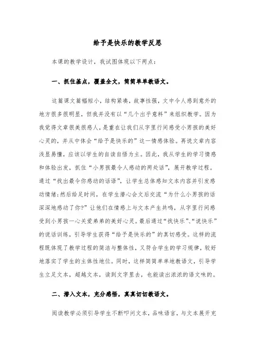 《给予是快乐的》教学反思本课的教学设计,我试图体现以下两点:一、抓住基点,覆盖全文,简简单单教语文。