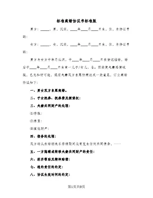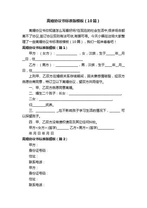 离婚协议书模板标准版【十篇】离婚协议书模板标准版篇1男方:身份证号码:女方:身份证号码:男女双方于____年__月__日于__处登记结婚,因男女双方感情完全破裂,已无和好可能,无法继续共同生活。