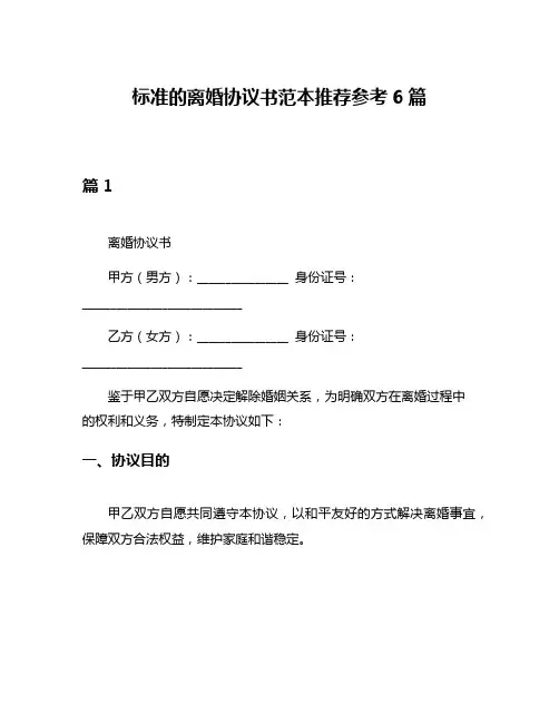 标准的离婚协议书范本推荐参考6篇篇1离婚协议书甲方(男方):________________ 身份证号:____________________________乙方(女方):________________ 身份证号:____________________________鉴于甲乙双方自愿决定解除婚姻关系,为明确双方在离婚过程中的权利和义务,特制定本协议如下:一、协议目的甲乙双方自愿共同遵守本协议,以和平友好的方式解决离婚事宜,保障双方合法权益,维护家庭和谐稳定。