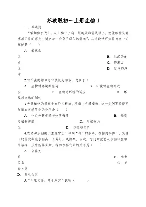 苏教版初一上册生物1一、单选题1.“假如你去天山,从山脚往上爬,超越天山雪线以上,就能够看见青凛凛的雪的寒光中挺立着一朵朵玉琢似的雪莲”,从这段话可知雪莲生长的环境是()A.低寒山区 B.洪涝的地点 C.高寒山区 D.冰冷的湖泊2.竹节虫的躯体与竹枝极为相似,这属于()A.生物对环境的阻碍B.环境对生物的适应 C.生物对环境的适应 D.环境对生物的制约3.大豆植物的根部生有许多根瘤,根瘤中有根瘤菌,这一实例要紧说明细菌在自然界中的作用是()A.作为分解者参与物质循环B.能引起植物疾病C.与植物共生 D.与植物竞争4.农民种水稻的田里经常长一种叫“稗”的杂草,在相同条件下,其种子的萌发率比水稻高,长势好,成熟早,因此,专门难把它从水稻田里驱除洁净.从中能够得知,稗和水稻之间的关系是()A.合作关系 B.竞争关系 C.捕食关系D.共生关系5.“千里之堤,溃于蚁穴”说明()A.生物适应环境B.生物对环境产生阻碍C.环境阻碍生物 D.环境适应生物6.俗语说“大树底下好乘凉”“千里之堤,溃于蚁穴”.这都表达了()A.生物能阻碍环境B.生物能适应环境C.环境能阻碍生物的生存D.生物与环境能够互相阻碍7.森林能增加大气湿度,增加降雨量,这说明()A.环境阻碍生物B.生物适应环境C.生物阻碍环境 D.生物和环境能合作8.在贫瘠的土地上,小麦生长不行而大豆却生长较好,这是由于()A.大豆能进行光合作用B.大豆的细胞核里有DNAC.大豆的呼吸不消耗有机物D.大豆根部共生有根瘤菌9.“螳螂捕蝉,黄雀在后”揭示的是动物之间的()A.捕食关系 B.合作关系 C.竞争关系D.互利关系10.蚯蚓在土壤中活动,能够使土壤疏松,蚯蚓的排泄物还能增加土壤肥力。
