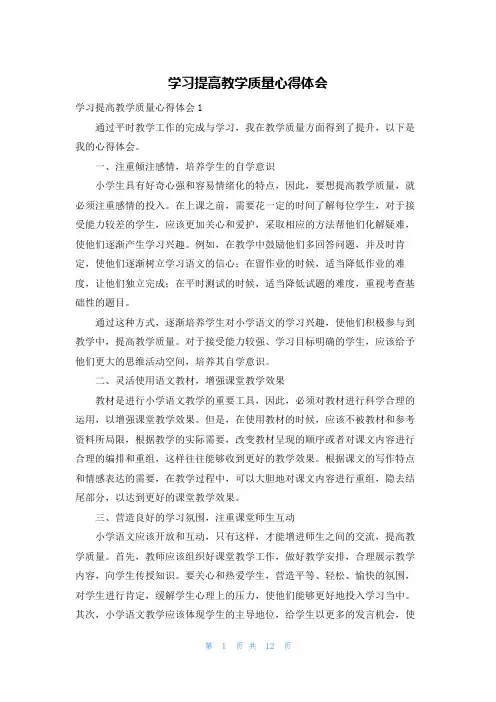 学习提高教学质量心得体会学习提高教学质量心得体会1通过平时教学工作的完成与学习,我在教学质量方面得到了提升,以下是我的心得体会。