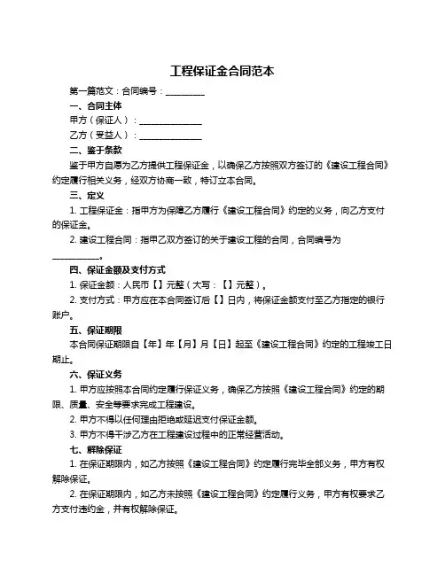 工程保证金合同范本第一篇范文:合同编号:__________一、合同主体甲方(保证人):________________乙方(受益人):________________二、鉴于条款鉴于甲方自愿为乙方提供工程保证金,以确保乙方按照双方签订的《建设工程合同》约定履行相关义务,经双方协商一致,特订立本合同。