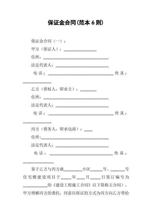 甲方签名:乙方签名:日期:工程保证金合同范本 (2) 甲方:××市×××房地产开发有限公司法定代表人:住所地:乙方:×××××房地产开发有限公司法定代表人:住所地:××市×××路甲乙双方此前共同参与了合作开发××市××街以北地块的项目,并参与签订了相关的合同文本。