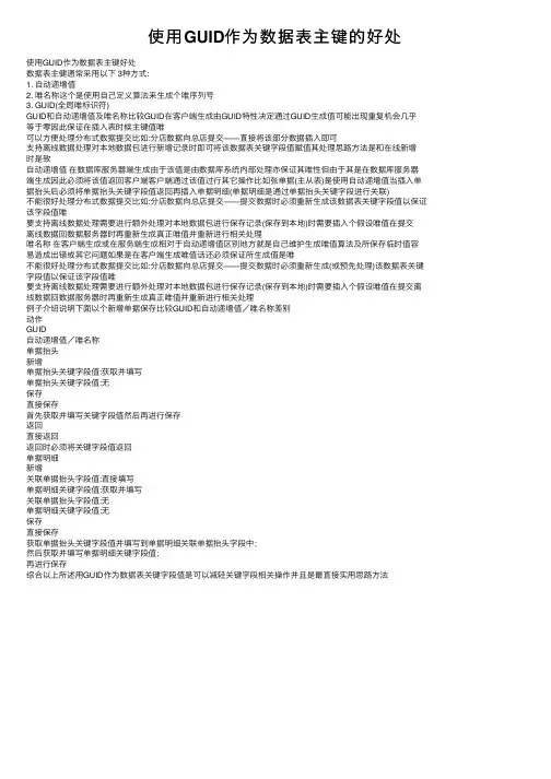 使⽤GUID作为数据表主键的好处使⽤GUID作为数据表主键好处数据表主健通常采⽤以下 3种⽅式:1. ⾃动递增值2. 唯名称这个是使⽤⾃⼰定义算法来⽣成个唯序列号3. GUID(全局唯标识符)GUID和⾃动递增值及唯名称⽐较GUID在客户端⽣成由GUID特性决定通过GUID⽣成值可能出现重复机会⼏乎等于零因此保证在插⼊表时候主键值唯可以⽅便处理分布式数据提交⽐如:分店数据向总店提交――直接将该部分数据插⼊即可⽀持离线数据处理对本地数据包进⾏新增记录时即可将该数据表关键字段值赋值其处理思路⽅法是和在线新增时是致⾃动递增值在数据库服务器端⽣成由于该值是由数据库系统内部处理亦保证其唯性但由于其是在数据库服务器端⽣成因此必须将该值返回客户端客户端通过该值过⾏其它操作⽐如张单据(主从表)是使⽤⾃动递增值当插⼊单据抬头后必须将单据抬头关键字段值返回再插⼊单据明细(单据明细是通过单据抬头关键字段进⾏关联)不能很好处理分布式数据提交⽐如:分店数据向总店提交――提交数据时必须重新⽣成该数据表关键字段值以保证该字段值唯要⽀持离线数据处理需要进⾏额外处理对本地数据包进⾏保存记录(保存到本地)时需要插⼊个假设唯值在提交离线数据回数据服务器时再重新⽣成真正唯值并重新进⾏相关处理唯名称在客户端⽣成或在服务端⽣成相对于⾃动递增值区别地⽅就是⾃⼰维护⽣成唯值算法及所保存临时值容易造成出错或其它问题如果是在客户端⽣成唯值话还必须保证所⽣成值是唯不能很好处理分布式数据提交⽐如:分店数据向总店提交――提交数据时必须重新⽣成(或预先处理)该数据表关键字段值以保证该字段值唯要⽀持离线数据处理需要进⾏额外处理对本地数据包进⾏保存记录(保存到本地)时需要插⼊个假设唯值在提交离线数据回数据服务器时再重新⽣成真正唯值并重新进⾏相关处理例⼦介绍说明下⾯以个新增单据保存⽐较GUID和⾃动递增值/唯名称差别动作GUID⾃动递增值/唯名称单据抬头新增单据抬头关键字段值:获取并填写单据抬头关键字段值:⽆保存直接保存⾸先获取并填写关键字段值然后再进⾏保存返回直接返回返回时必须将关键字段值返回单据明细新增关联单据抬头字段值:直接填写单据明细关键字段值:获取并填写关联单据抬头字段值:⽆单据明细关键字段值:⽆保存直接保存获取单据抬头关键字段值并填写到单据明细关联单据抬头字段中;然后获取并填写单据明细关键字段值;再进⾏保存综合以上所述⽤GUID作为数据表关键字段值是可以减轻关键字段相关操作并且是最直接实⽤思路⽅法。