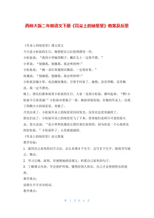 《耳朵上的绿星星》教案及反思精选一、教学内容本节课选自小学语文教材第三册《语文》第七单元,具体内容为《耳朵上的绿星星》。