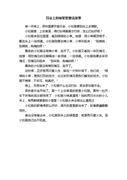 )3)小草、玫瑰花是怎样说的?4)小松鼠为什么不摘花草,用小草和玫瑰花来打扮自己?5)老师发现有的小朋友在户外活动时会采花草?以后还能不能采?为什么?6)那你认为小松鼠会去参加音乐会吗?为什么?(幼儿讨论)2.讲述第二段故事后提问:1)小松鼠去参加音乐会了吗?2)当小松鼠轻盈地跳上舞台时,为什么所有的观众都惊呆了?为什么?3)小松鼠耳朵上的绿星是从哪儿来的呢?4) 萤火虫为什么要帮助小松鼠?(幼儿讨论)三、拓展思维,情感教育,分享成果讨论分析,理解小松鼠耳朵上"绿星"的秘密,懂得做事要替别人着想。